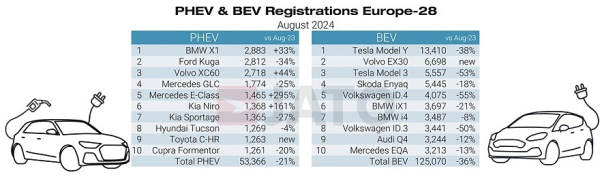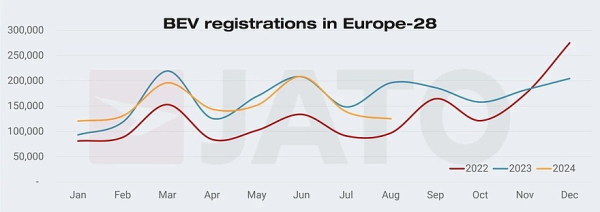 Аналитическое агентство JATO Dynamics, публикующее статистику по европейскому авторынку на основе данных регистраций, вчера сообщило, что в августе продажи электромобилей в Европе показали рекордное падение с начала 2017 года: продано 125 070 электромобилей, что на 36% меньше продаж в августе 2023 года. ACEA (Европейская ассоциация автопроизводителей) даёт ещё более удручающую для «озеленителей» цифру: по её данным, на учёт в августе встали только 92 627 электромобилей (-43,9% по сравнению с АППГ).