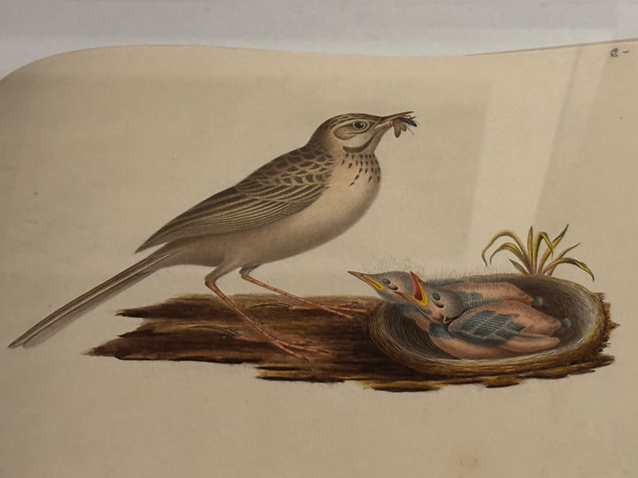 Если вспомнить, как о декабристах рассказывают в школе, то все ограничивается самим восстанием и дальнейшей казнью пяти человек. Да коротким комментарием о том, что остальных отправили в ссылку, но что там было со ссыльными, приходится узнавать «внеклассно». На выставке акцент делают на устройстве их быта и тут же иллюстрируют рисунками самих декабристов — как жили люди в ссылке, чем занимались. Например, когда в 1830 году декабристов переводили в Петровский завод, то идти туда пришлось пешком, ночевать — в юртах, охраняли их бурятские всадники, на стоянках «гуляли и любовались местоположением». С особым вниманием относились к природе, которая впечатляла ссыльных — собирали гербарии и коллекции насекомых. Отсюда — альбомы с изображением природы, на верхней крышке одного из таких надпись ПТИЧКИ, он хранит в себе множество рисунков с изображением птичьей жизни, трогательный сюжет удалось застать нам — кормление птенцов, у мамы-птички в клювике жучок, а малыши раскрыли желтые ротики в ожидании еды.